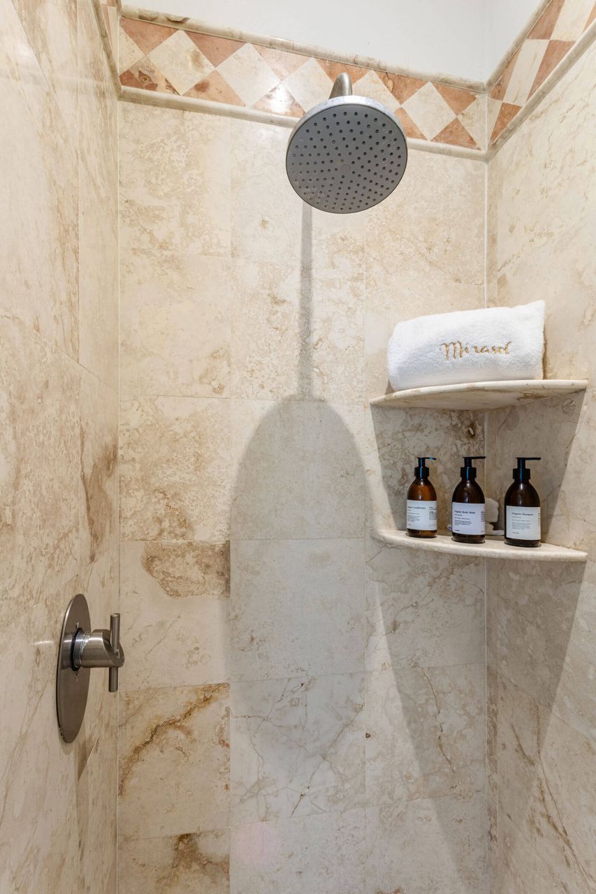 The villa itself consists of three levels, each level including three bedrooms (with king and queen beds and ensuite baths), terraces and a small kitchenette. The ground level includes a large kitchen where groups can gather around the large dining table and enjoy meals together. The large backyard area is accompanied with a lavish private swimming pool, offering the ideal moment to relax. In the evening take it to the rooftop and enjoy the beautiful terrace where you can watch the sun set.