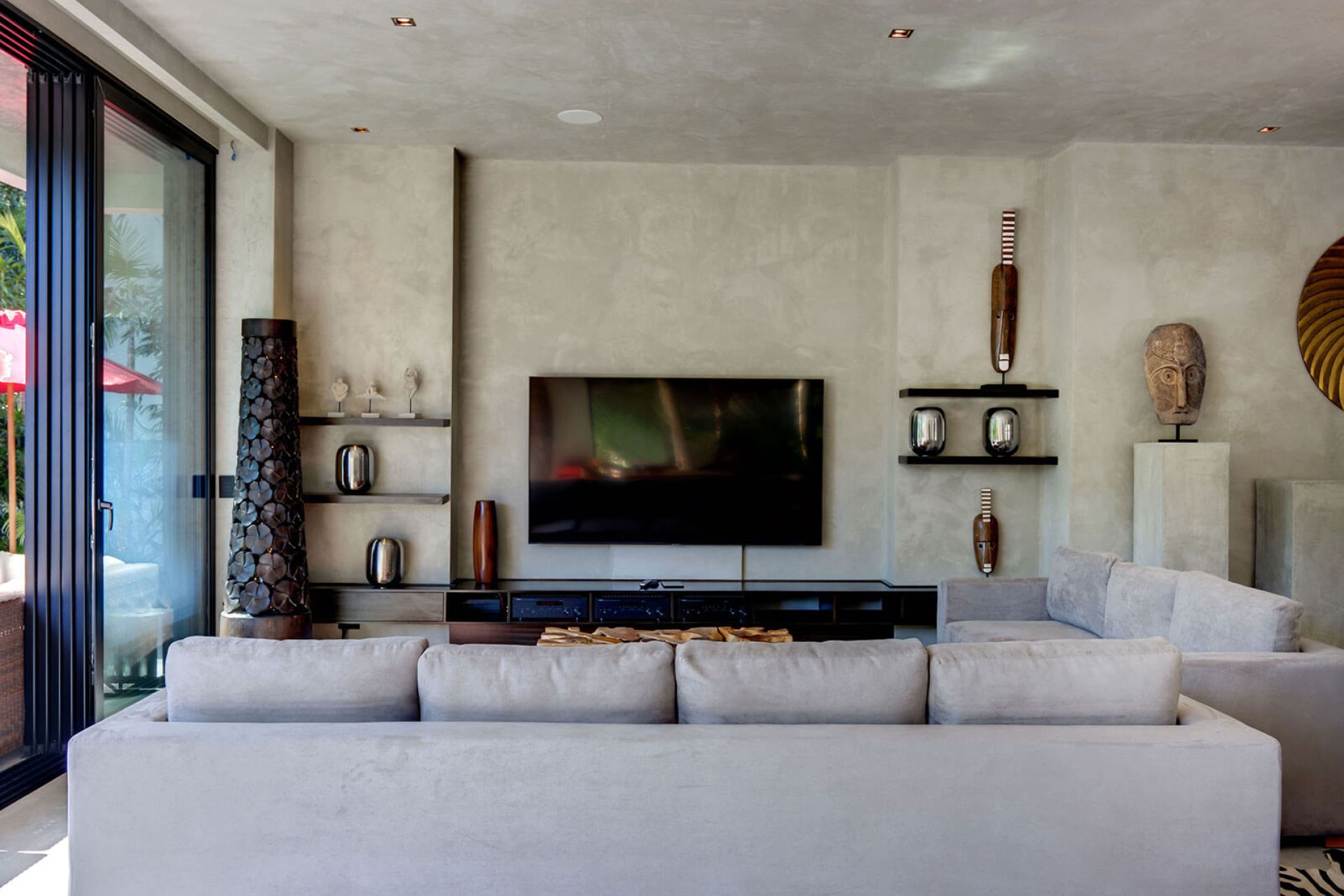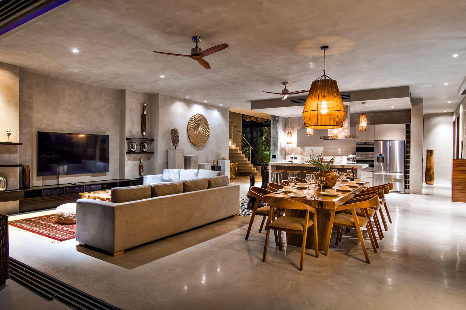 This sophisticated 5-bedroom villa in Playacar combines modern elegance with lush tropical landscaping, offering a serene escape just minutes from Playa del Carmen’s top beaches. Overlooking a scenic golf course, the home features strong cement architecture softened by boho-chic, feminine décor. Every space, from the open-plan living area to the stylish suites, is designed with an upscale, avant-garde touch.