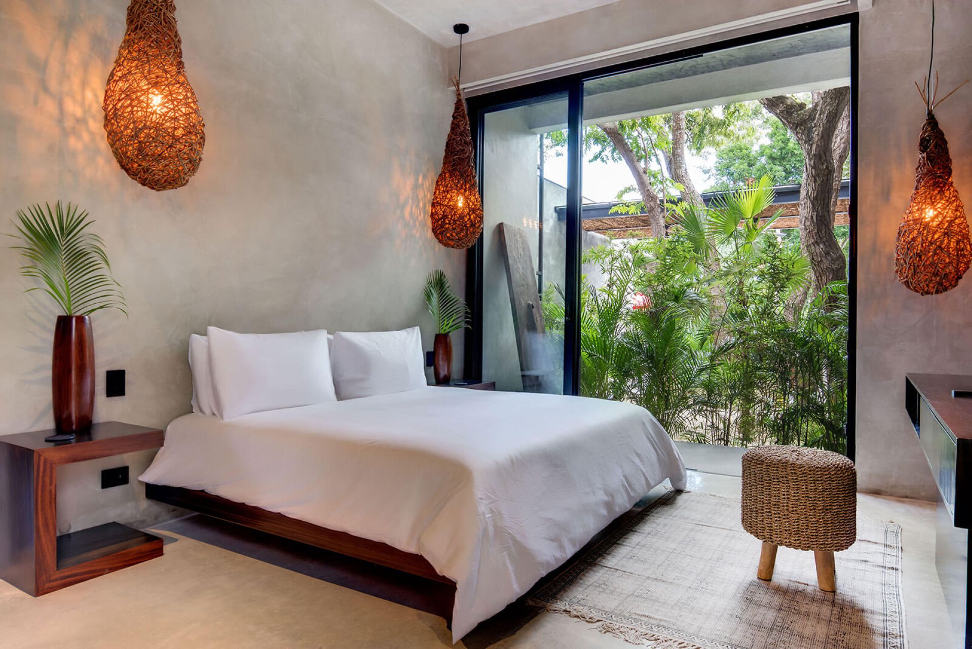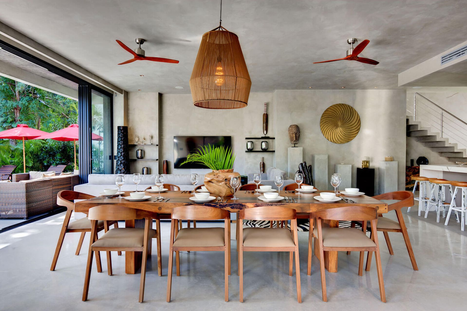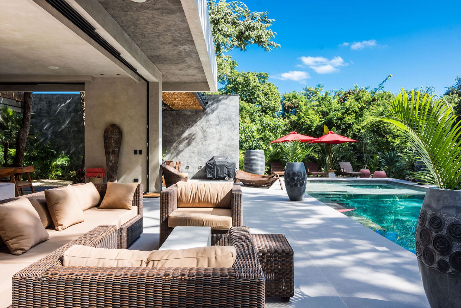 The villa offers both privacy and luxury with spacious indoor and outdoor areas surrounded by native greenery. Two upstairs bedrooms share a balcony with garden views, while a ground-floor suite offers direct access to the pool and deck. All bedrooms include large ensuite bathrooms. Daily housekeeping and private chef services are included, making this a perfect retreat for a refined getaway.