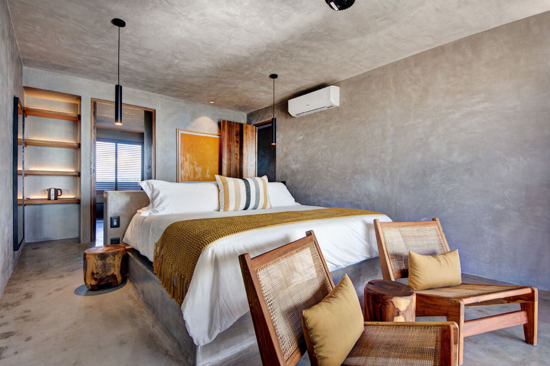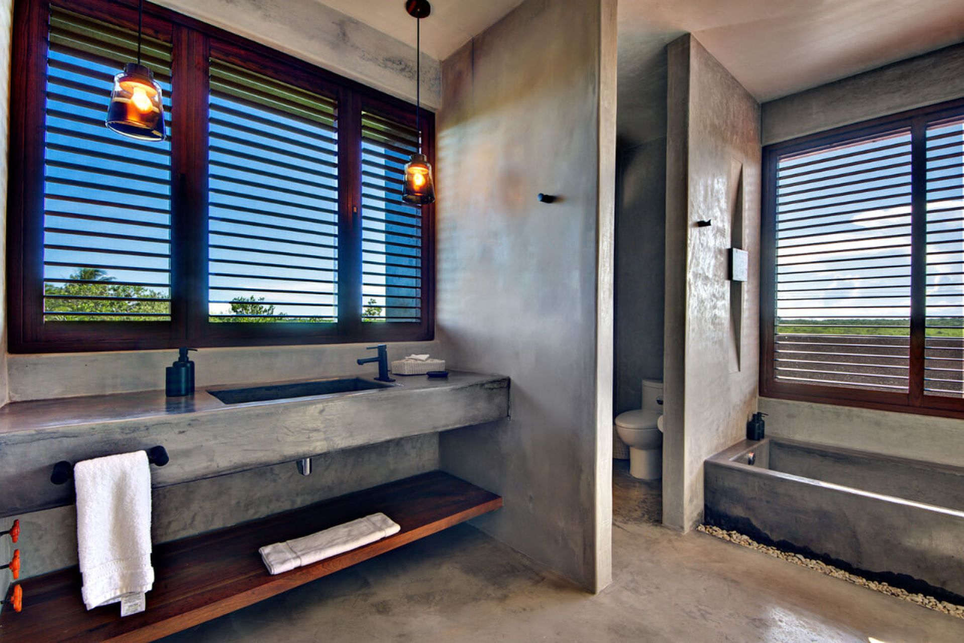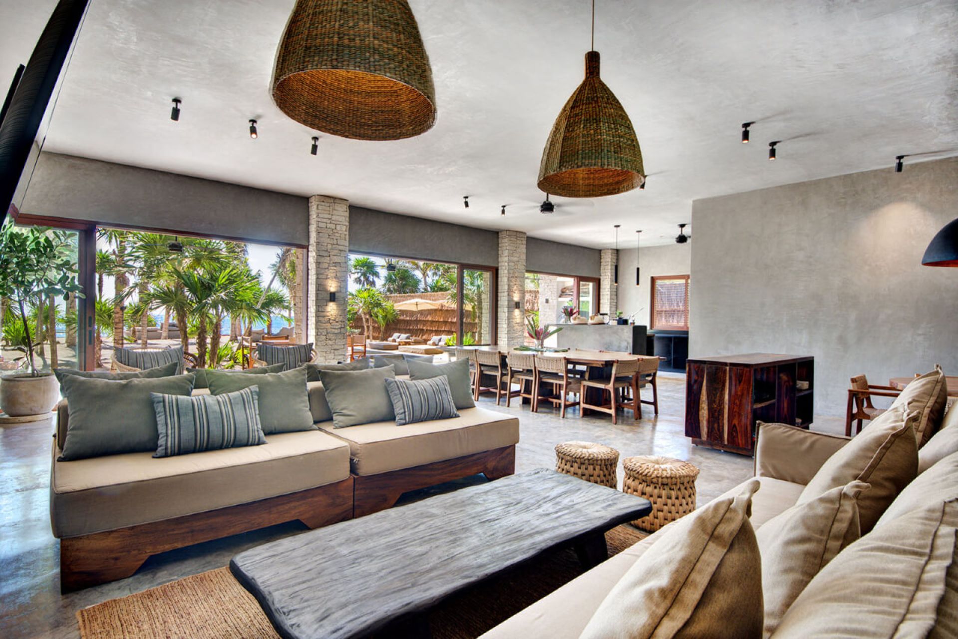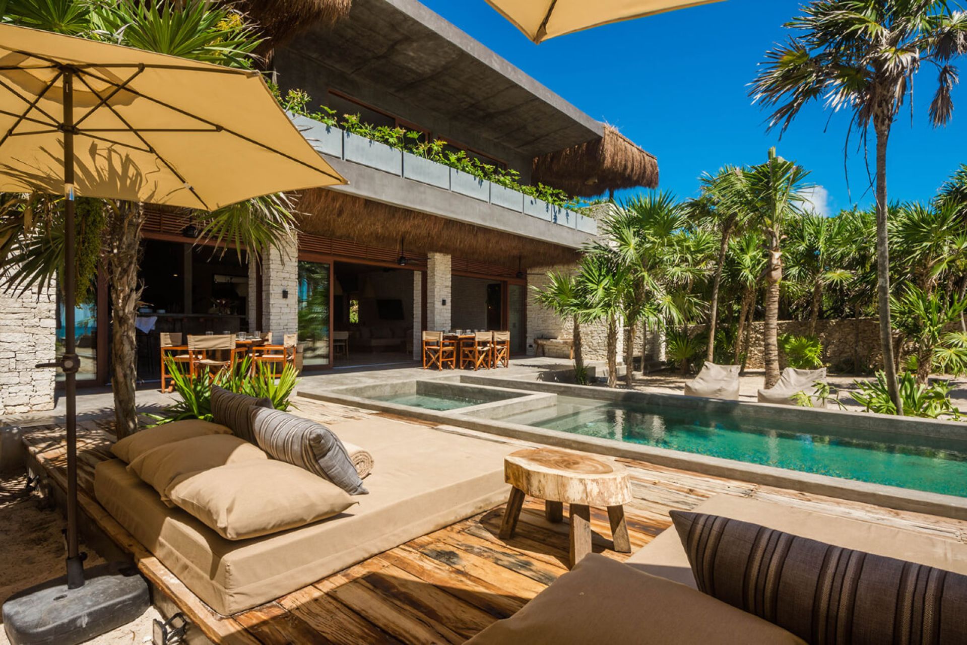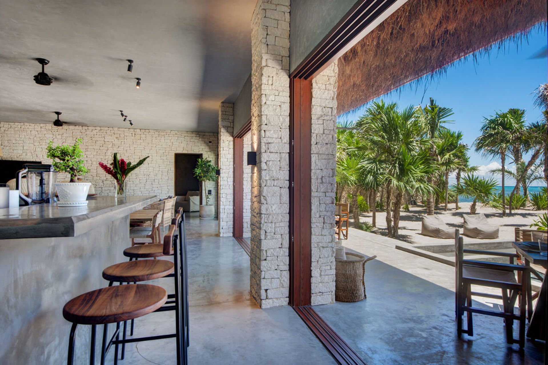 This minimalist beachfront villa in Soliman Bay is the perfect blend of laid-back Caribbean charm and sophisticated design, ideal for relaxing with friends and family. Its open floor plan connects indoor and outdoor spaces, letting nature in and creating a cozy atmosphere for gathering. Polished concrete walls and wooden furnishings add effortless elegance, while the pool, jacuzzi, and wooden deck lead to a private beach shaded by coconut palms.