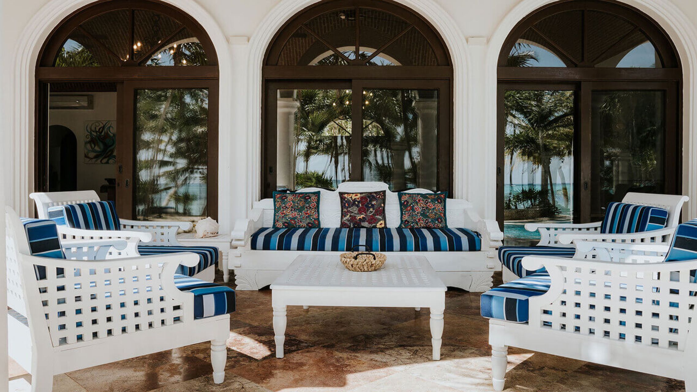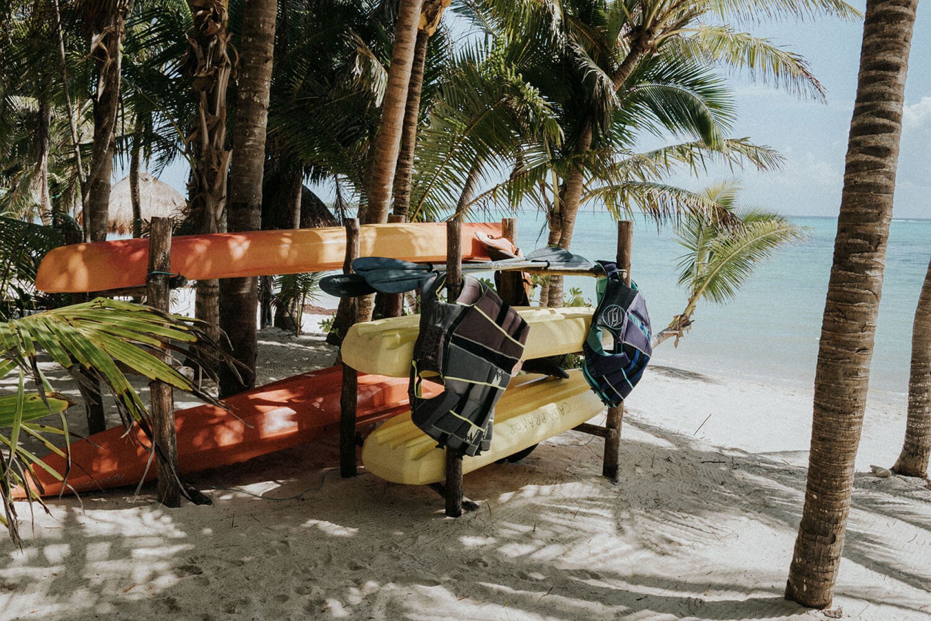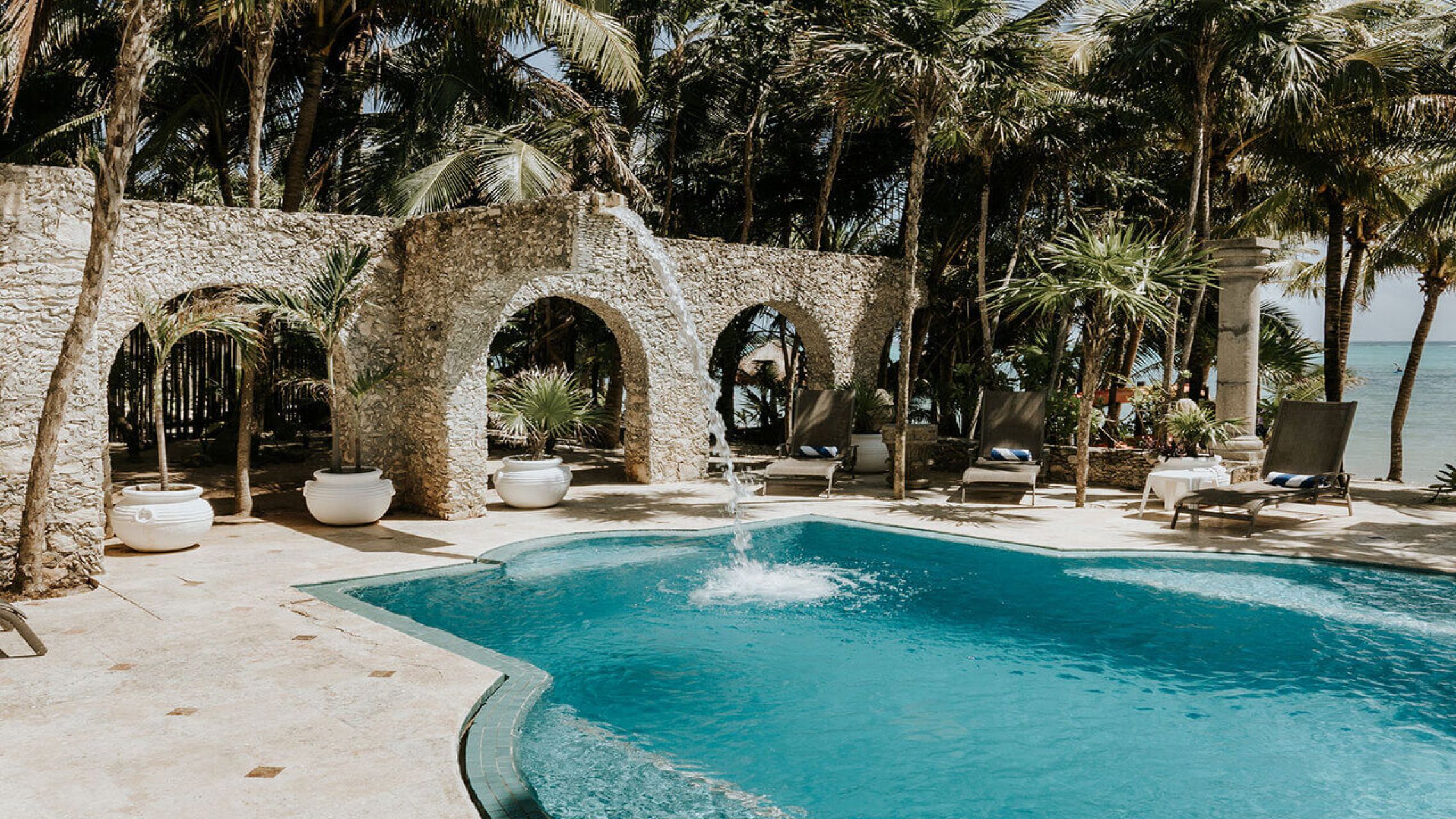 Outside, a charming stone aqueduct leads to a pool and a private beach with sunbeds and palm-hung hammocks. Guests can kayak in the tranquil bay, one of the Riviera Maya’s most peaceful spots. Just 20 km north of Tulum, this villa combines privacy and convenience, with daily housekeeping, a private chef, and security included for a truly relaxing getaway.