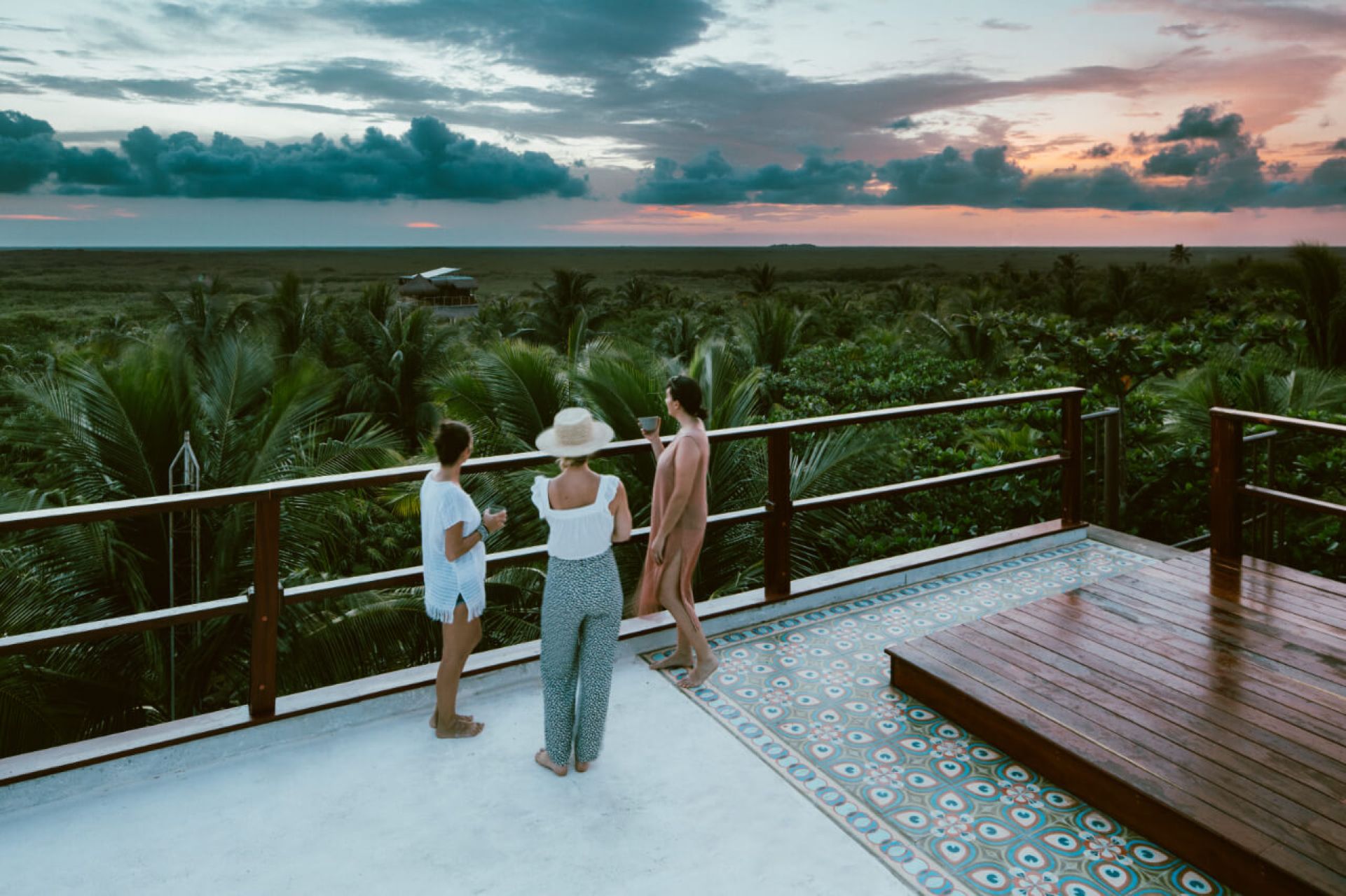 The Oceanfront Master Suite is ideal for families or close friends who want a home-like space while exploring Tulum. This open-plan suite features two king-size canopy beds, a cozy living room, a dining area, and a kitchen, plus a spacious balcony with sweeping views of the Caribbean. Start your day with coffee on the balcony, and spend peaceful afternoons lounging in a locally made hammock. The beds can be separated by drapes for privacy, though this suite is best suited for those comfortable sharing space. Each morning, enjoy a complimentary breakfast with organic Chiapas coffee, fresh fruit, granola, and rotating Mexican favorites like peppery chilaquiles.