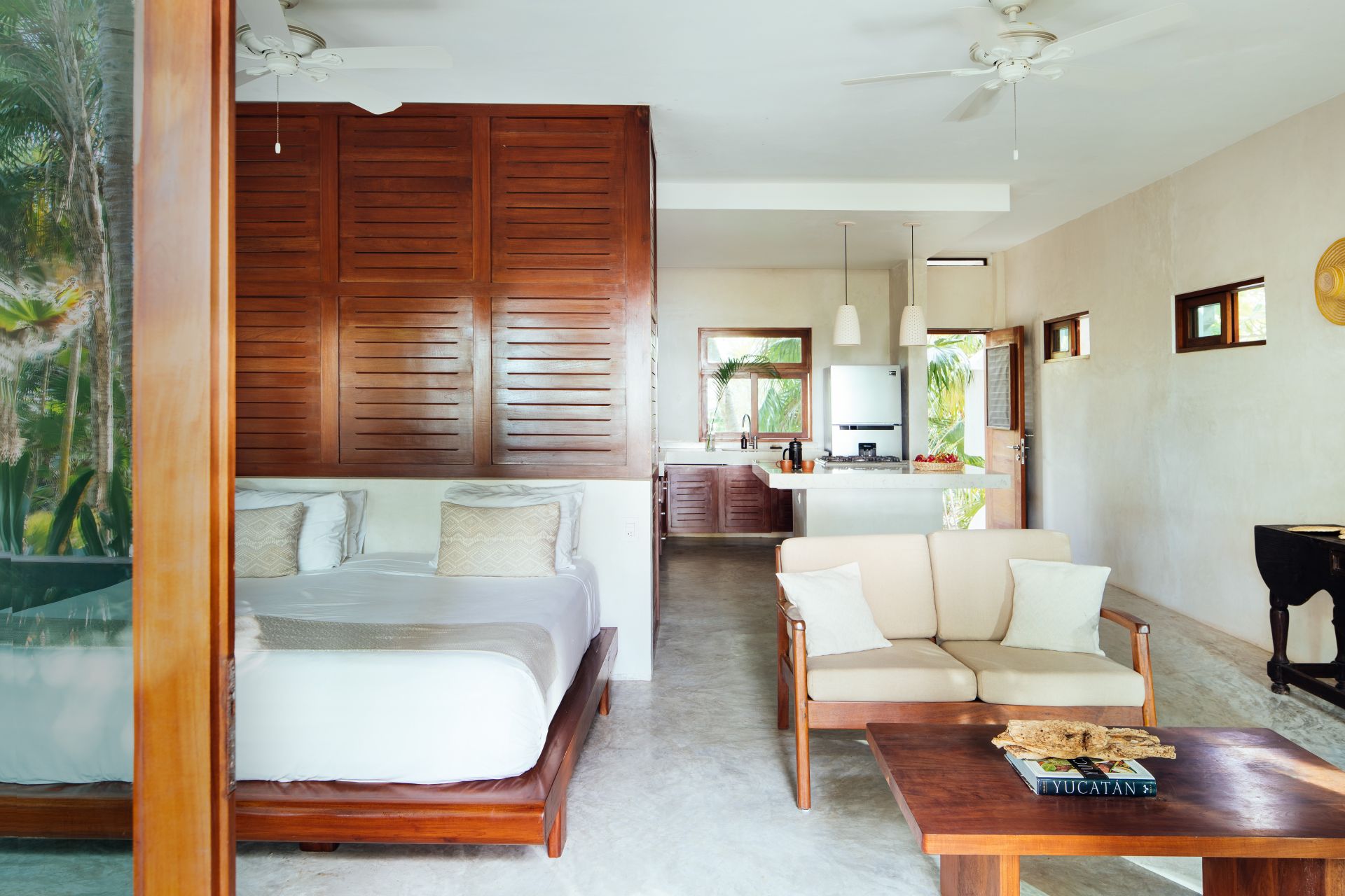 Locally crafted furniture meets modern Danish style in this peaceful suite. We love the floor to ceiling windows where guests can witness the Caribbean sea and the Sian Ka’an reserve come together from the comfort of their king-size bed (optional twin) or their private balcony (sun chairs at the ready). Additionally, this suite has a spacious private bathroom, walk-in closet/dressing room, and a fully equipped kitchen with granite counters and bar style seating. Occupancy is set at 2 persons.
