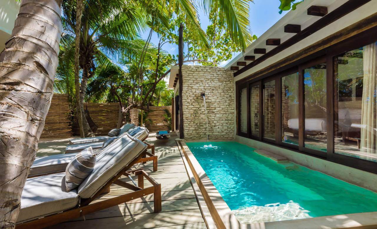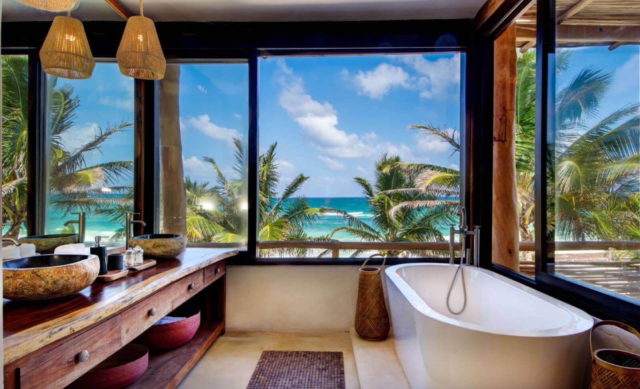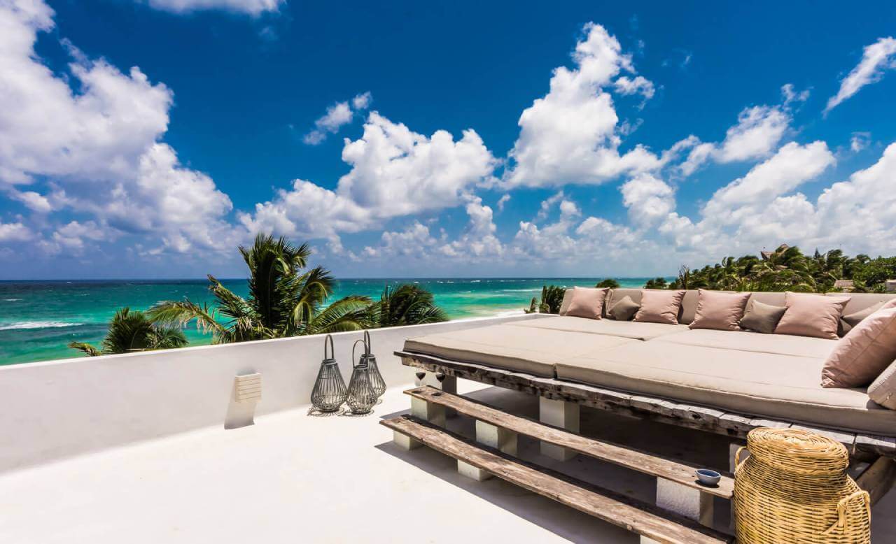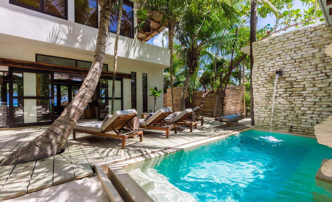Each of the nine bedrooms includes an en-suite bathroom, private terrace, and tranquil garden views, with handcrafted wood details sourced from the Yucatán Peninsula. Cool off in one of the three private pools with a mezcal margarita in hand, then head up to the rooftop terraces for unforgettable sunset views. Villa 1 offers three bedrooms, Villa 2 has two, and Villa 3—the largest—features four, along with its own oceanfront terrace, rooftop daybed, outdoor bar, and private pool. Whether you’re planning a celebration or a serene escape, this Tulum retreat promises an unforgettable stay in paradise.