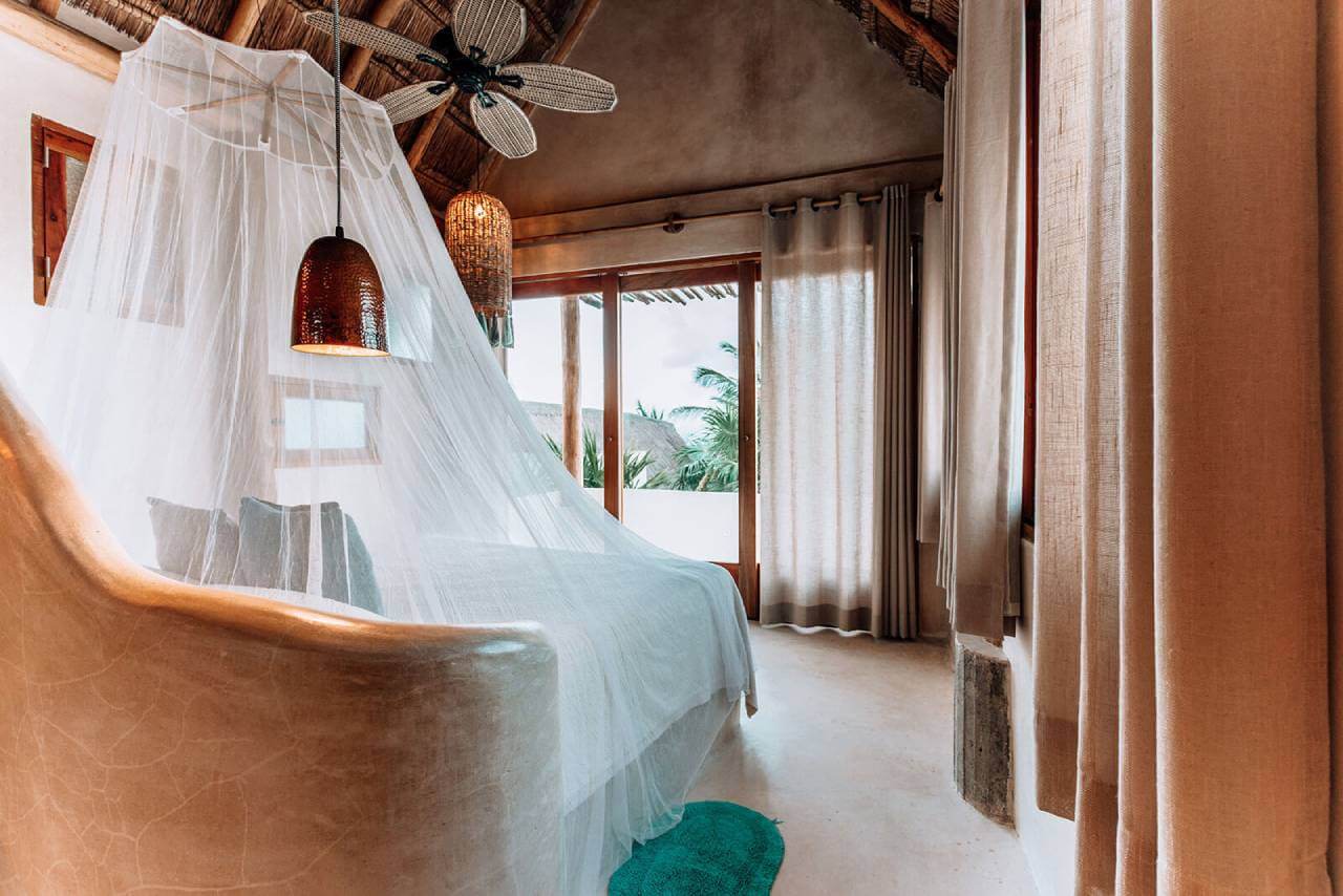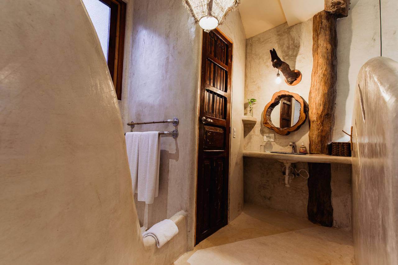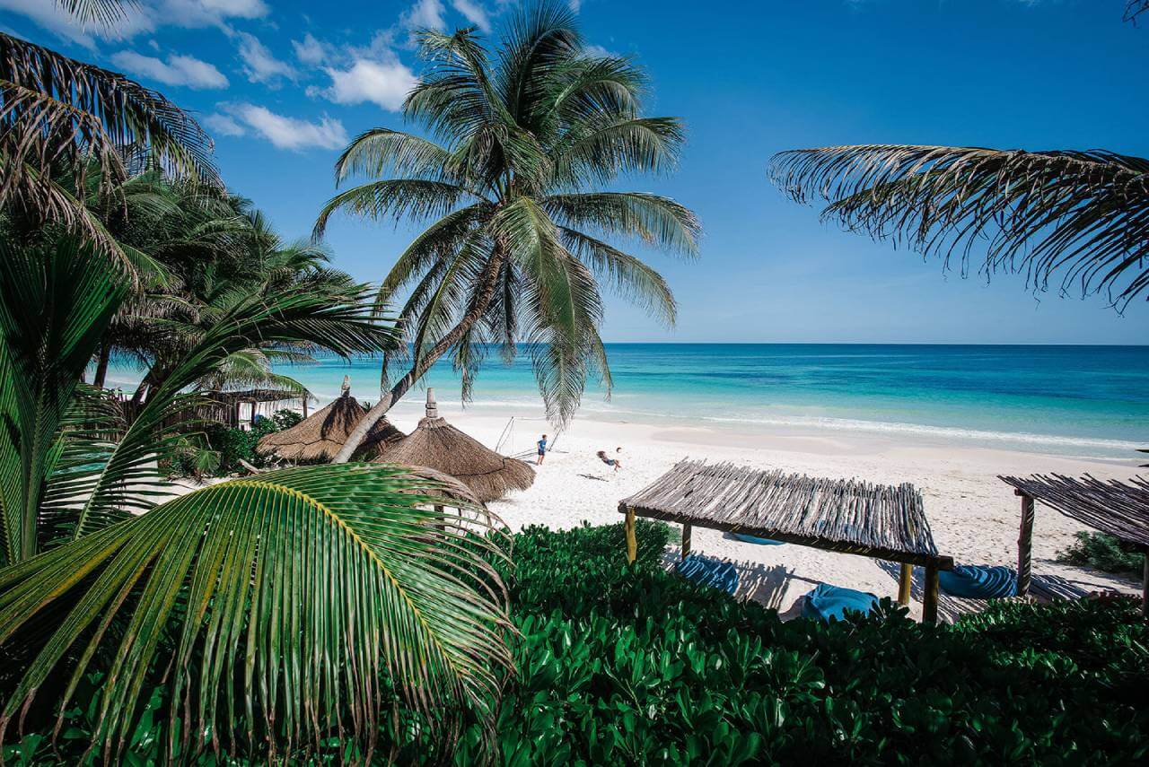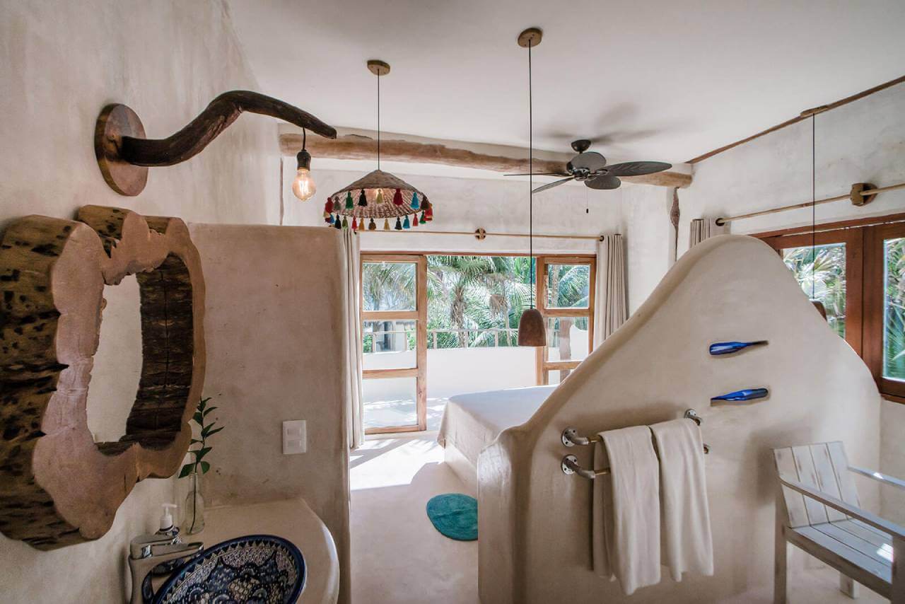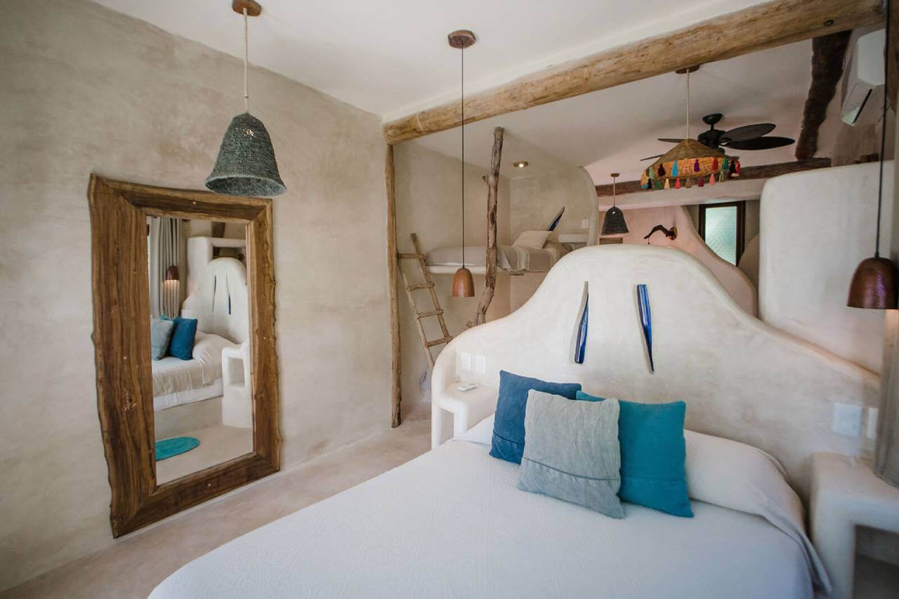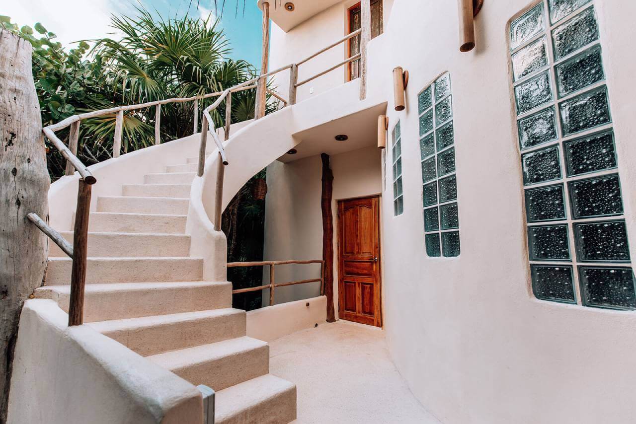 Casa de las Palmas is a stunning full-service vacation rental on Tulum Beach. This rental home has 3 bedrooms and sleeps 8. 1 bedroom is on the main floor with a queen-size bed and a balcony. Upstairs there are 2 more bedrooms with balconies, sea views, and private bathrooms. 1 upstairs bedroom has a king-size bed and the other has a queen-size bed plus 2 single beds. Natural elements and artistic touches throughout the house reflect the lovely laid-back vibe and feel of Tulum.