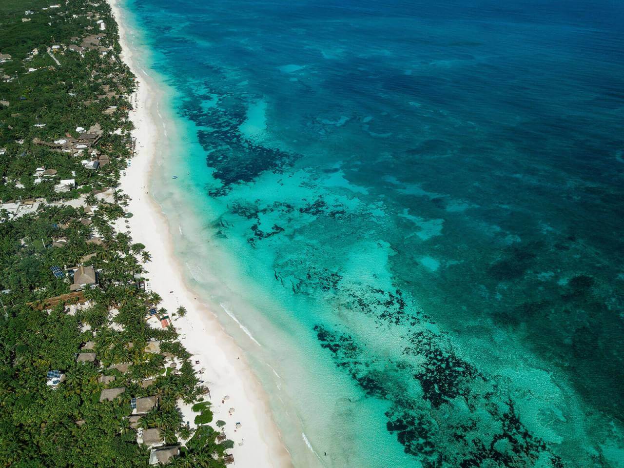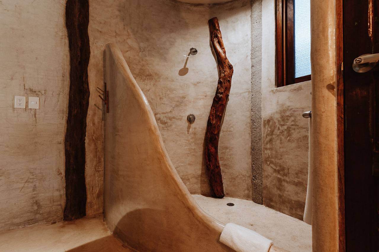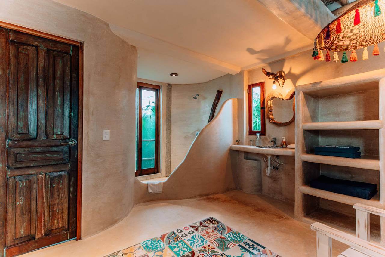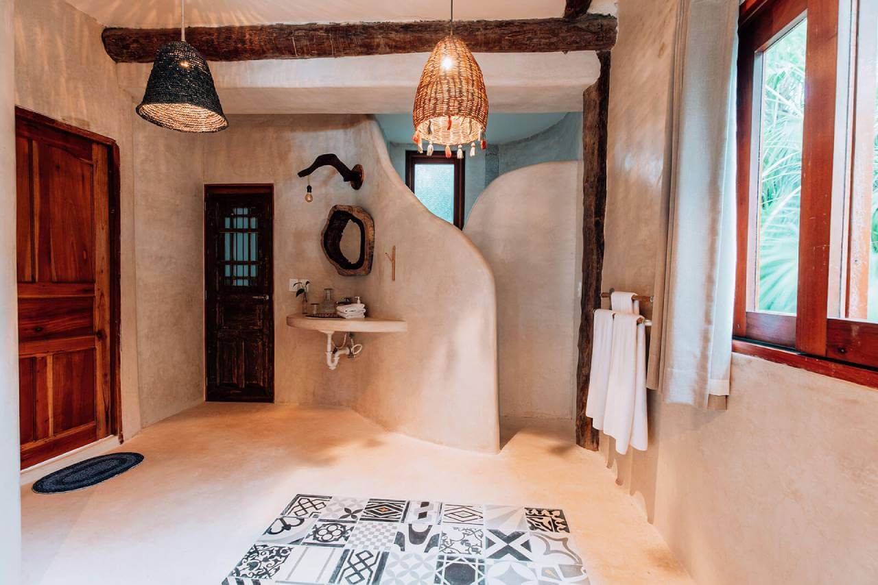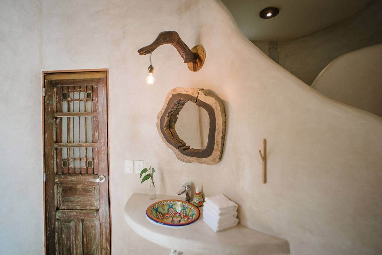 Casa de las Palmas is a stunning full-service vacation rental on Tulum Beach. This rental home has 3 bedrooms and sleeps 8. 1 bedroom is on the main floor with a queen-size bed and a balcony. Upstairs there are 2 more bedrooms with balconies, sea views, and private bathrooms. 1 upstairs bedroom has a king-size bed and the other has a queen-size bed plus 2 single beds. Natural elements and artistic touches throughout the house reflect the lovely laid-back vibe and feel of Tulum.