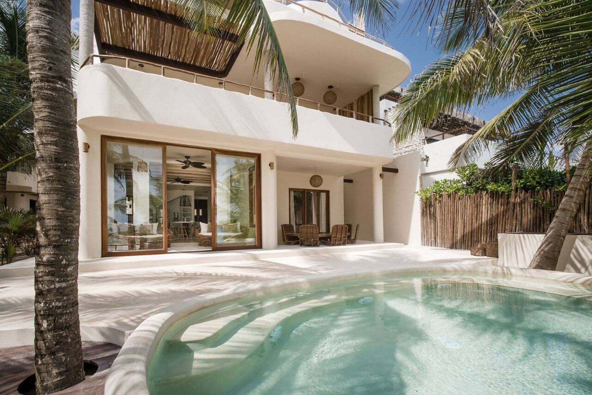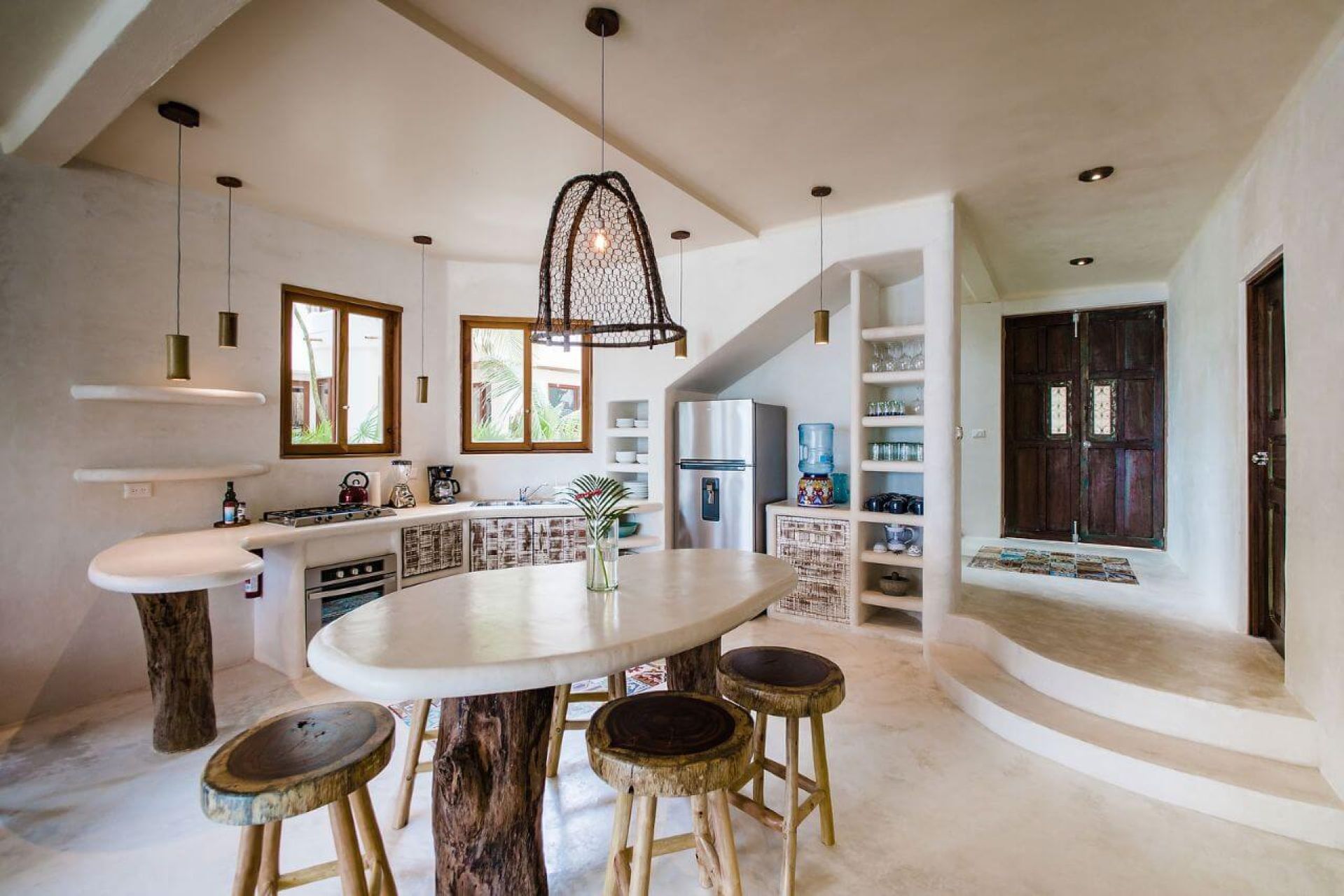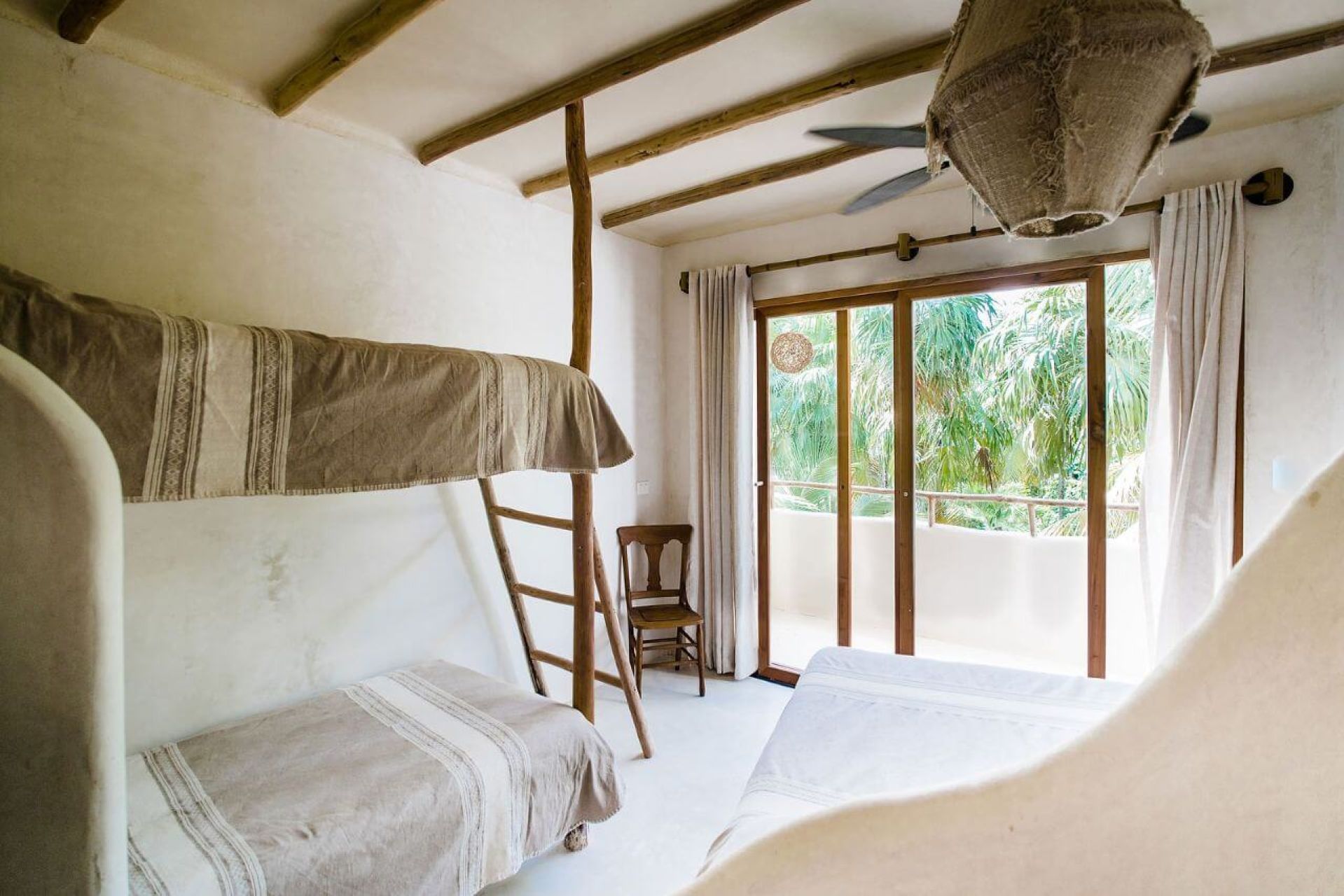 Inside, the villa includes a full kitchen, dining area, and seven bedrooms. Two upstairs rooms feature king beds, ensuite bathrooms, and private terraces with ocean views. Other rooms offer a mix of queen, double, and bunk beds, all with stylish, comfortable touches and varying levels of privacy. Bedrooms 6 and 7, located on the top floor with a separate entrance, can also be rented individually as the Tulum Beachfront Penthouse for 6. Housekeeping is included, and guests can add private chef services and airport transfers to complete their all-inclusive Caribbean escape.