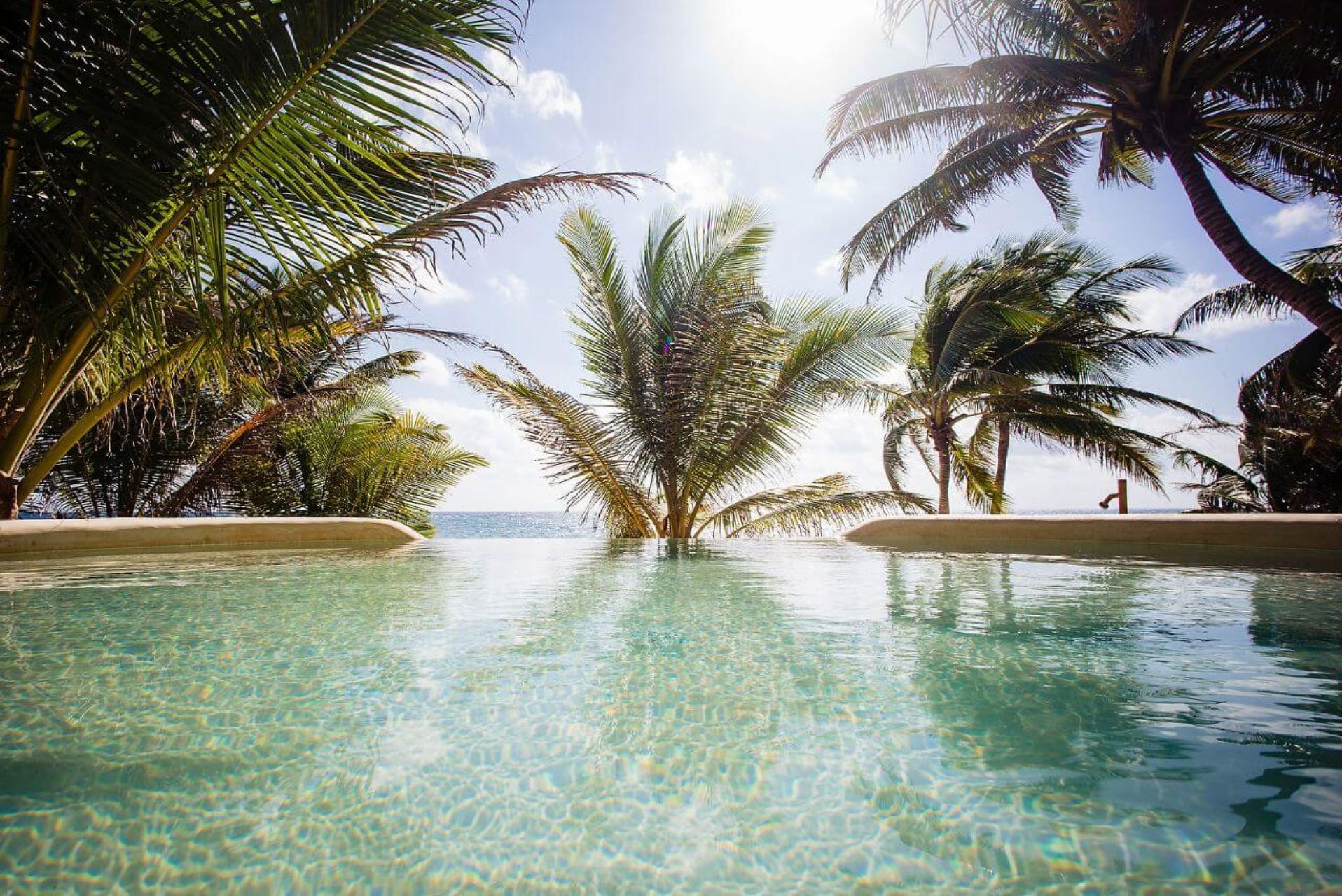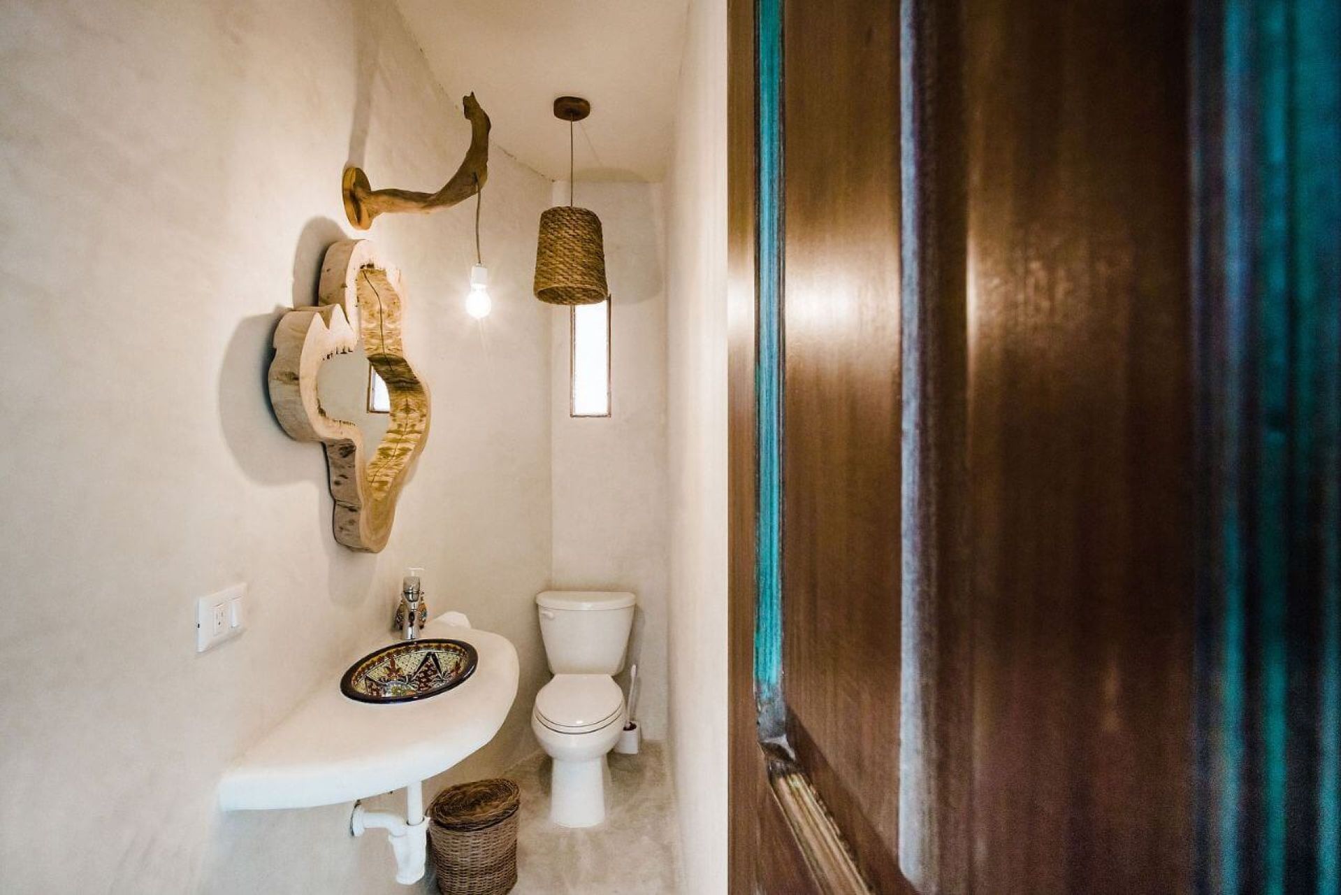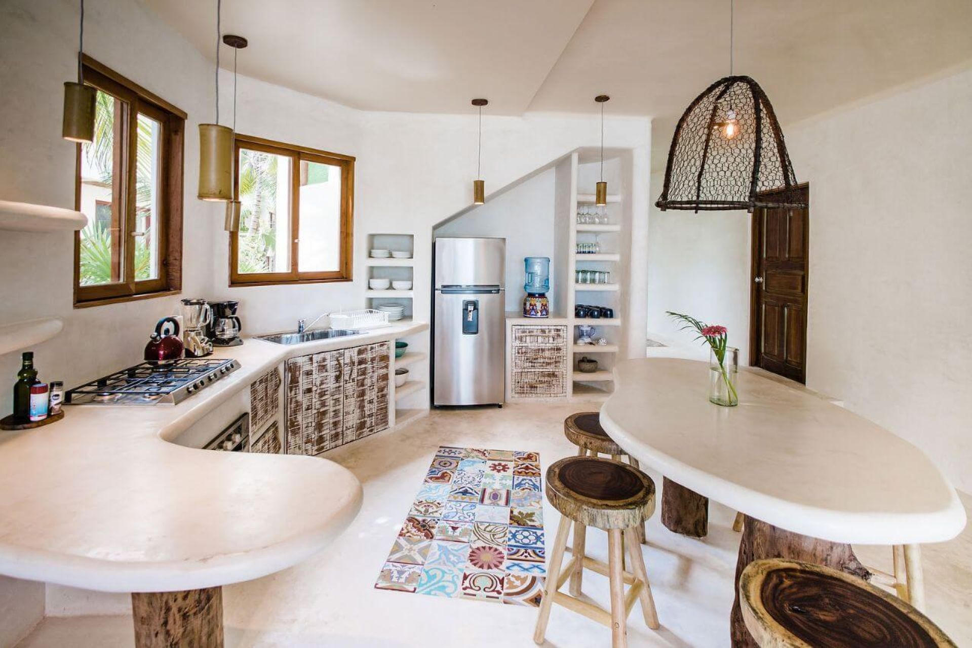 Inside, the villa includes a full kitchen, dining area, and seven bedrooms. Two upstairs rooms feature king beds, ensuite bathrooms, and private terraces with ocean views. Other rooms offer a mix of queen, double, and bunk beds, all with stylish, comfortable touches and varying levels of privacy. Bedrooms 6 and 7, located on the top floor with a separate entrance, can also be rented individually as the Tulum Beachfront Penthouse for 6. Housekeeping is included, and guests can add private chef services and airport transfers to complete their all-inclusive Caribbean escape.