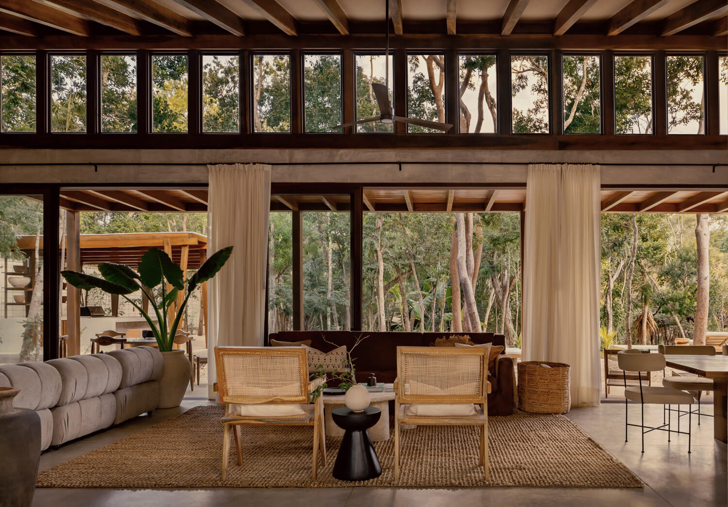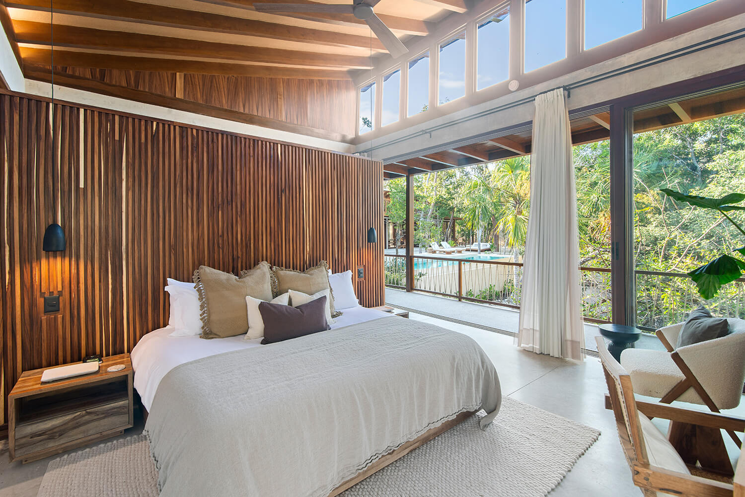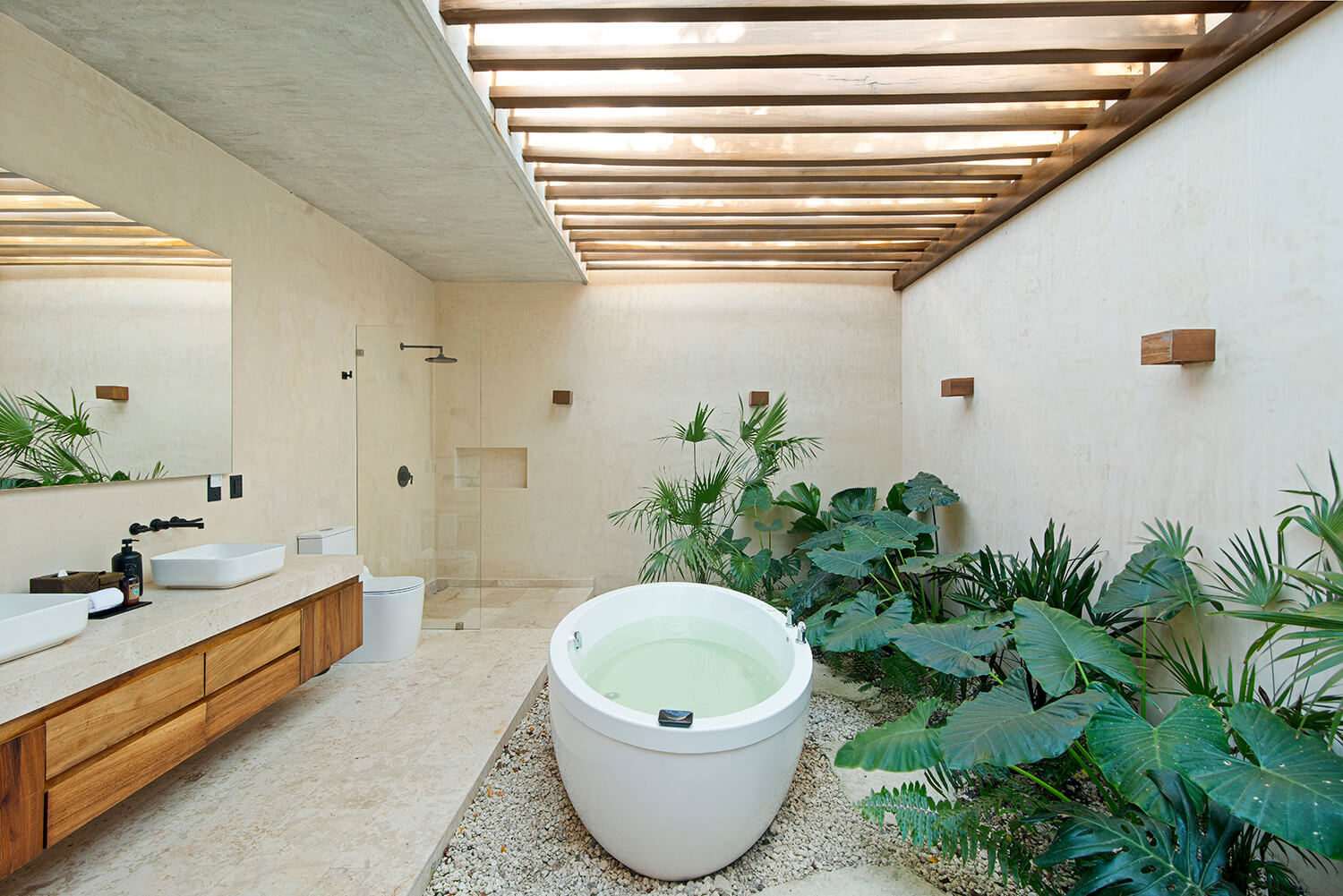 Welcome to Selva Sagrada, your sanctuary deep in Tulum’s jungle. This refined “L”‑shaped retreat seamlessly blends indoor and outdoor living with high ceilings, vaulted wooden accents, and walls of glass frame lush jungle panoramas. Slide open your bedroom doors and let the breeze in; each of the four suites includes its very own indoor outdoor bathroom, where stone bathtubs meet nature in perfect harmony