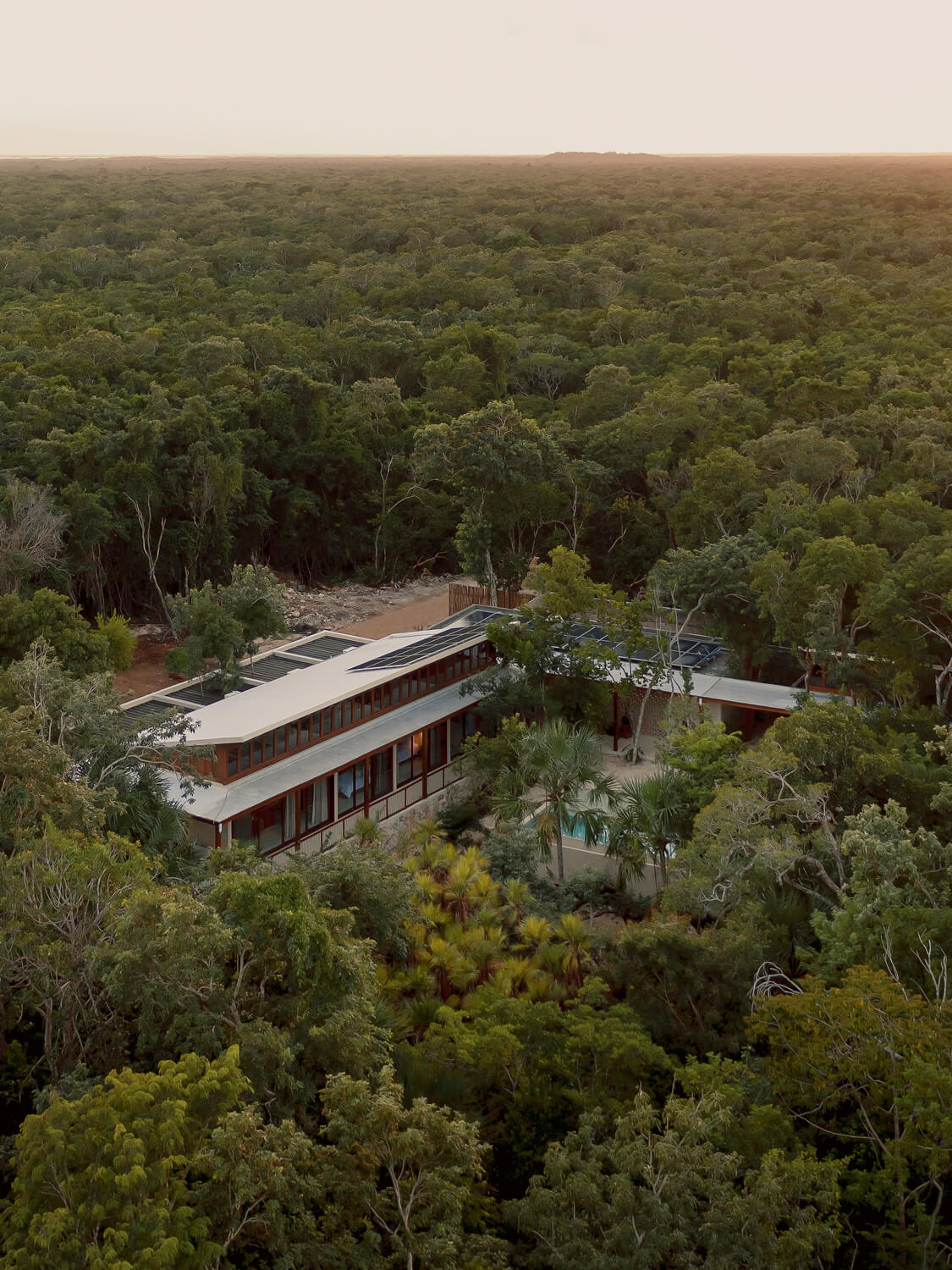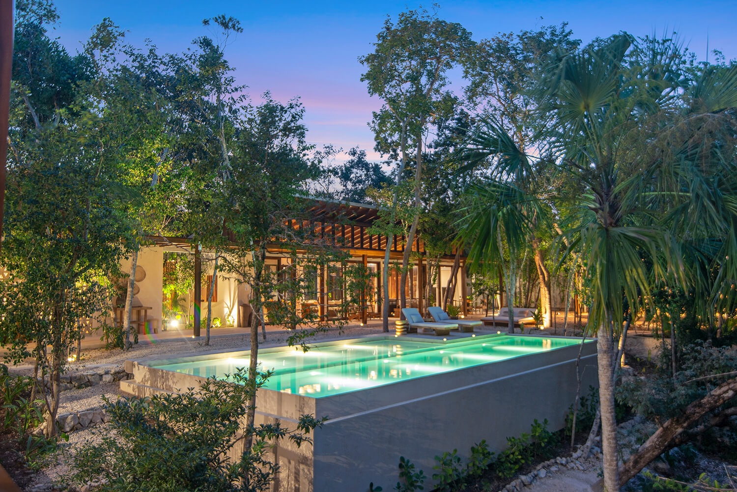 Outside is where the magic really happens. Cool off in the infinity pool that seemingly pours into the emerald canopy, and discover the hidden cenote tucked on the property grounds. Eco-conscious through and through, Selva Sagrada is fully off-grid, solar-powered, and beautifully integrated with the landscape. 77% of the land remains wild and intact. For groups seeking luxe, sustainable bliss just minutes from Tulum’s hotel zone and beaches, it’s a dreamy base. Add private chef service, concierge support, and even your own treehouse, and you’ve got the ultimate jungle escape.