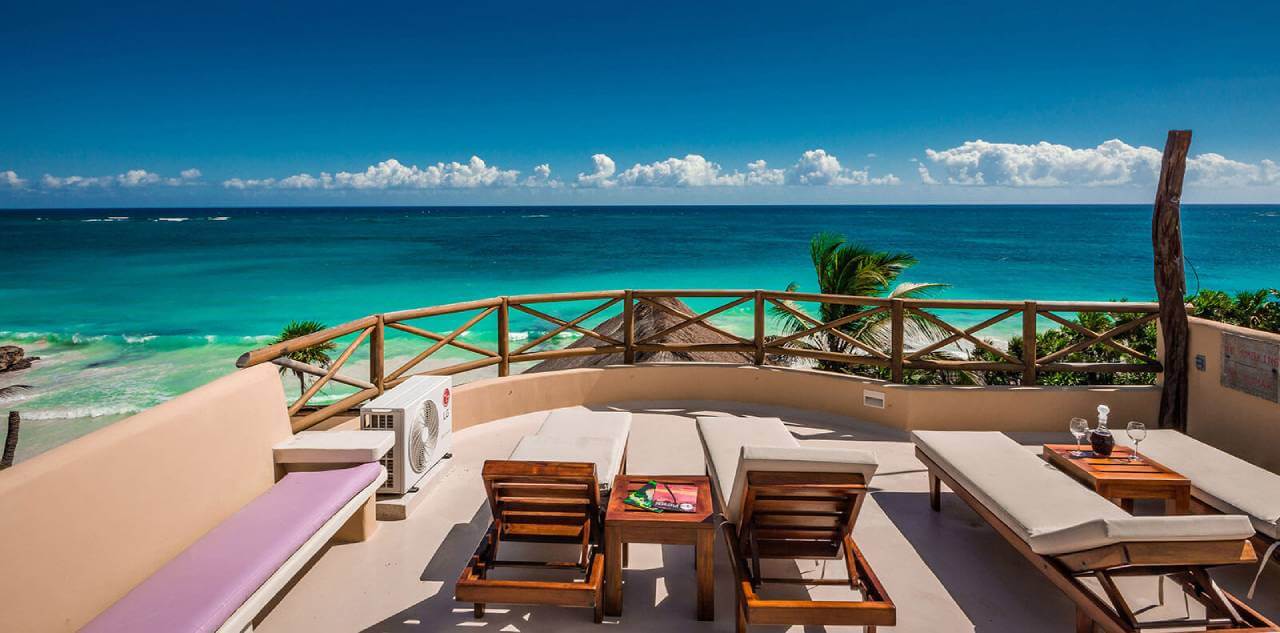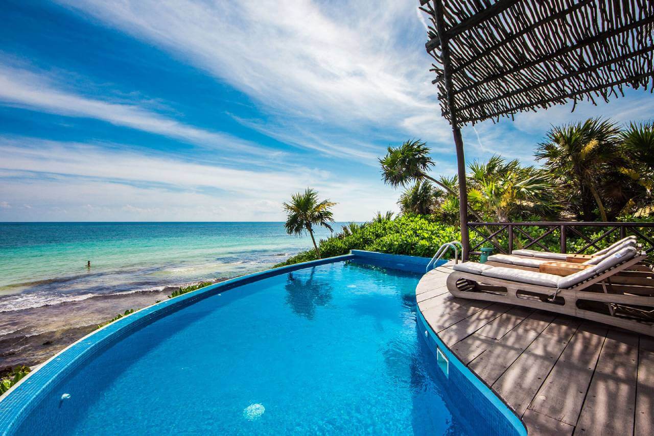 This beautiful villa features a grand palapa living room with panoramic views of the Caribbean Sea and beach. Located just 1.5 miles south of Tulum’s Mayan ruins and close to top restaurants, it offers a private pool facing the ocean and five king bedrooms with ensuite bathrooms, comfortably hosting up to ten guests. The elegant interiors blend ornate details with modern touches and unique antiques, creating a luxurious and inviting atmosphere.